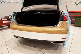 На крышке багажника используем вибродемпфер Comfort mat Dark D3 Premium. Материал не требует предварительного разогрева, наносится на очищенную и обезжиренную поверхность металла, прикатывается валиками. Пластиковая панель оклеивается Comfort mat Wave Expert: даже небольшой фрагмент шумопоглотителя позволяет ощутимо снизить уровень акустических помех.
