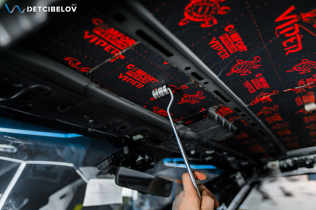 Следующий этап – шумоизоляция крыши. Максимально аккуратно чистыми одноразовыми перчатками демонтируем потолочную обшивку и обезжириваем поверхность потолка. После предварительной подготовки приступаем к шумоизоляции.