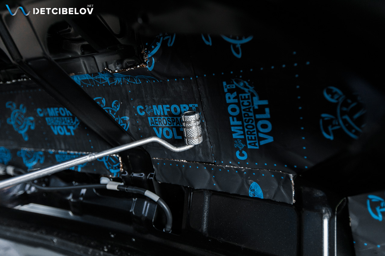 В качестве второго слоя используем Comfortmat Aerospace Volt (2,5 мм) — инновационный материал, состоящий из виброакустической мастичной основы со стохастическим распределением вспененных гранул (это повышает вибродемпфирующие и звукоизолирующие свойства несмотря на относительно низкую плотность виброакустической мастики) и лицевого покрытия из алюминиевой фольги из специального сплава Scale One, изготовленный по технологии Aerospace. Серия Aerospace служит материалом "Одного слоя", он совмещает в себе виброизоляционные и шумоизоляционные свойства одновременно. Самый лёгкий вибродемпфирующий материал в своём классе.