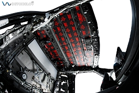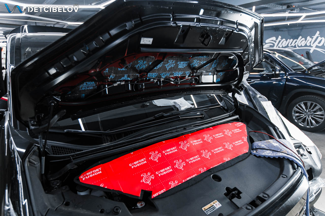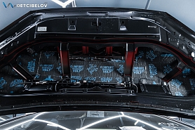 Капот. Внутреннюю поверхность капота обрабатываем материалом Comfortmat Aerospace Volt (2,5 мм), а на штатную шумотеплоизоляцию мы наклеили Comfort mat Fusion Red (3 мм).
