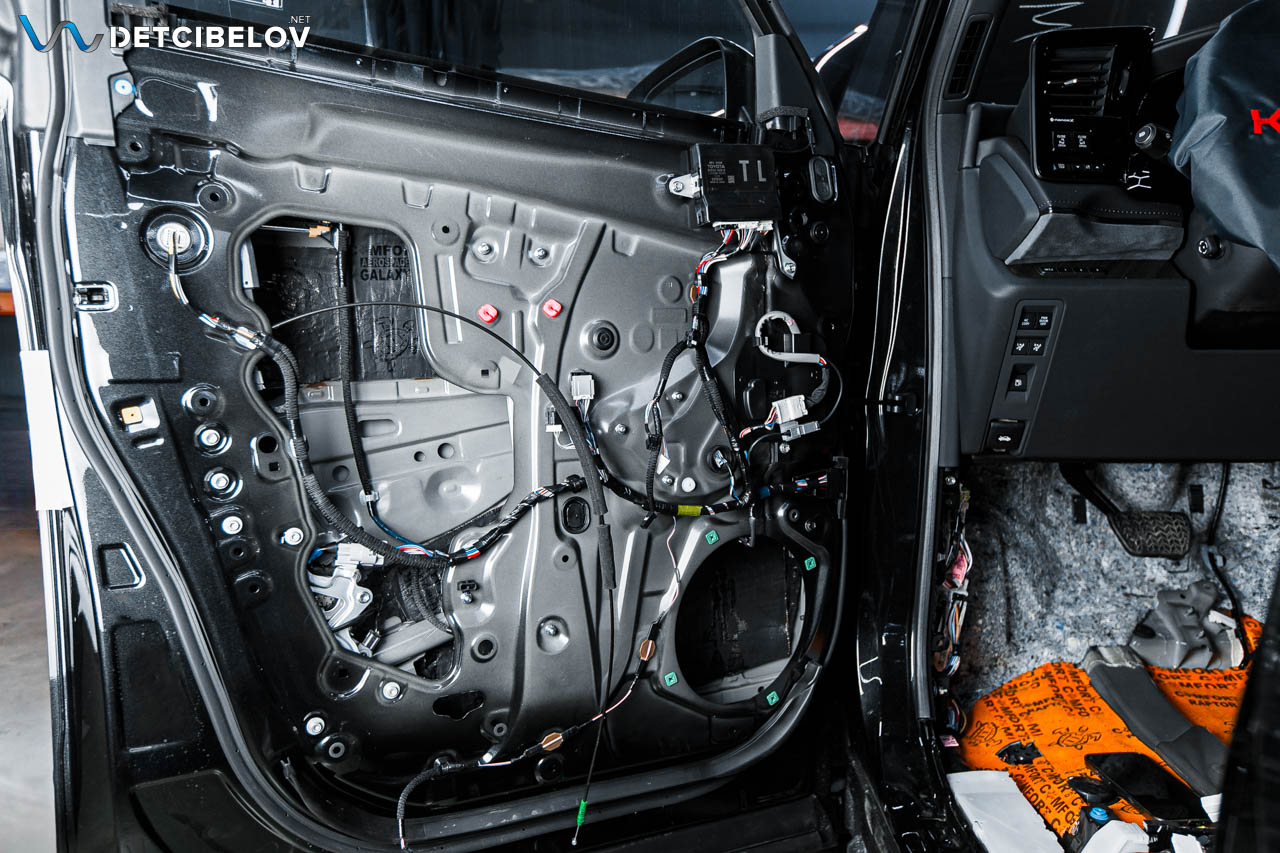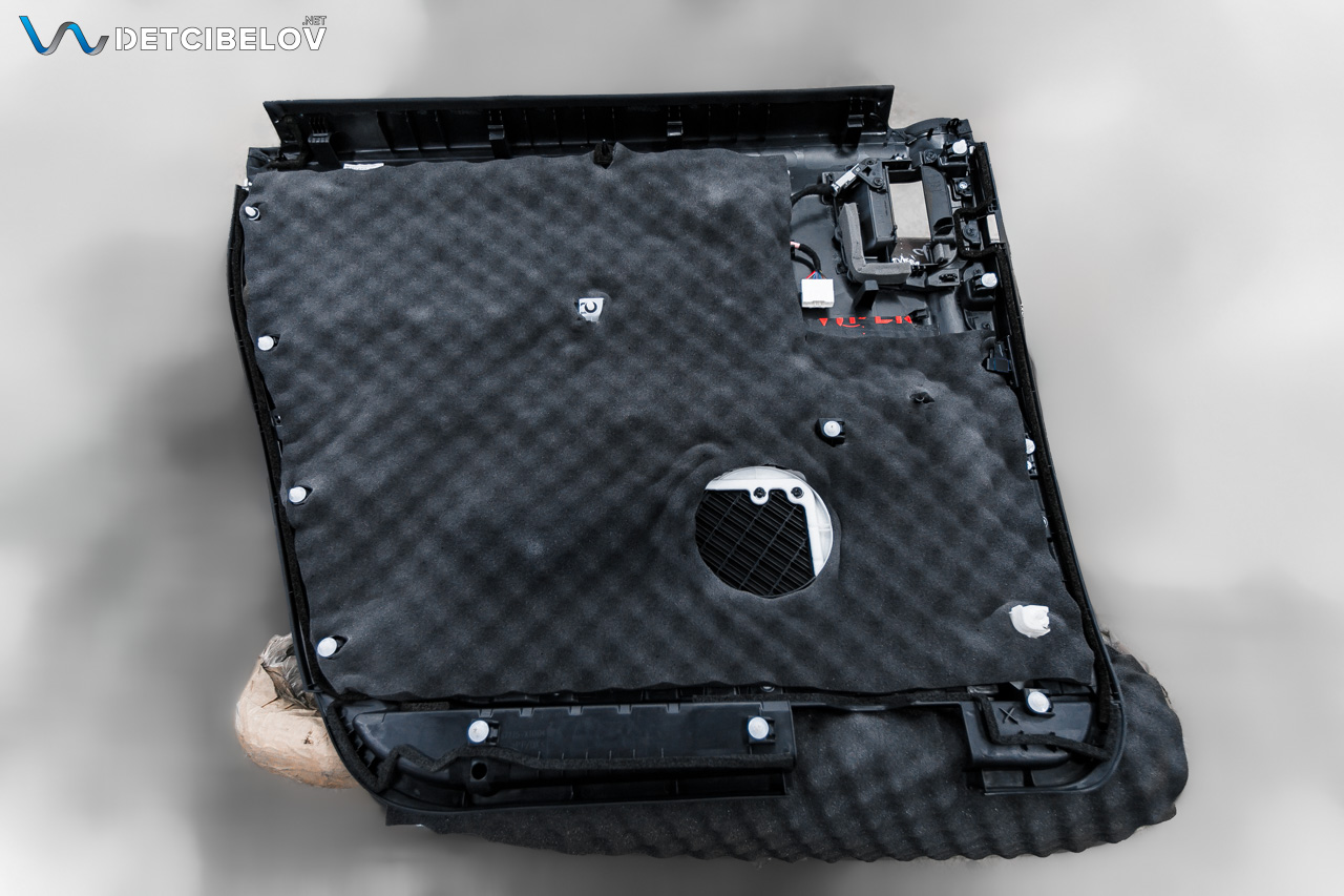 Работы по шумоизоляции начинаем с дверей. Максимально аккуратно разбираем дверные обшивки. После этого подготавливаем поверхность и обезжириваем все участки и наносим первый слой: Comfort mat Aerospace GALAXY — новый инновационный материал серии AEROSPACE, который состоит из виброакустической мастичной основы 5 мм толщиной со стохастическим распределением вспененных гранул, тяжелой звукоизоляционной мембраны 2 мм и лицевого покрытия из алюминиевой фольги из специального сплава SCALE ONE. Подобная структура обеспечивает высокие вибродемпфирующие свойства и достигает высокие звукоизоляционные характеристики