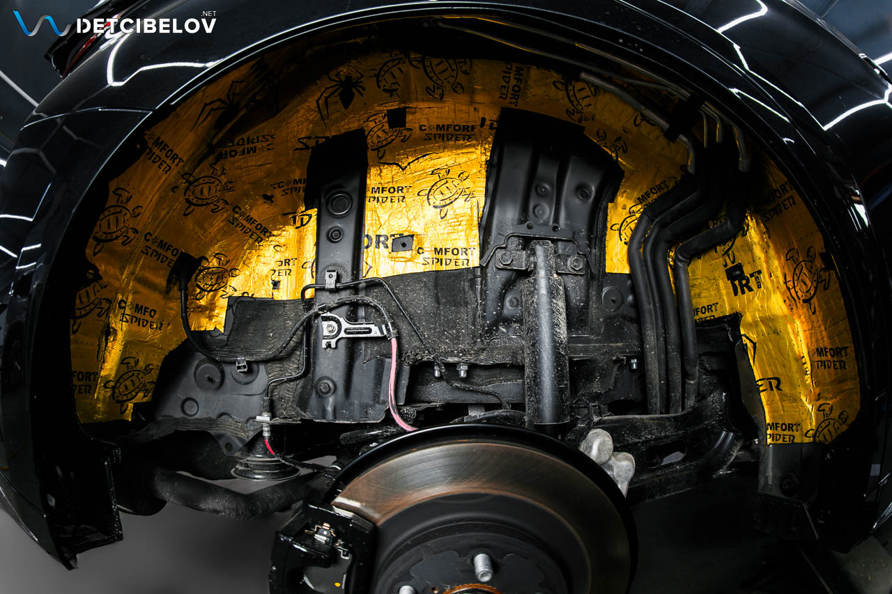 Финальным этапом шумоизоляции будет шумоизоляция колесных арок. Это позволит нам существенно усилить эффект снижения шума, издаваемого резиной автомобиля. Сначала снимаем 4 подкрылка, обезжириваем их поверхность и наносим следующие слои.