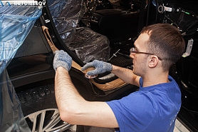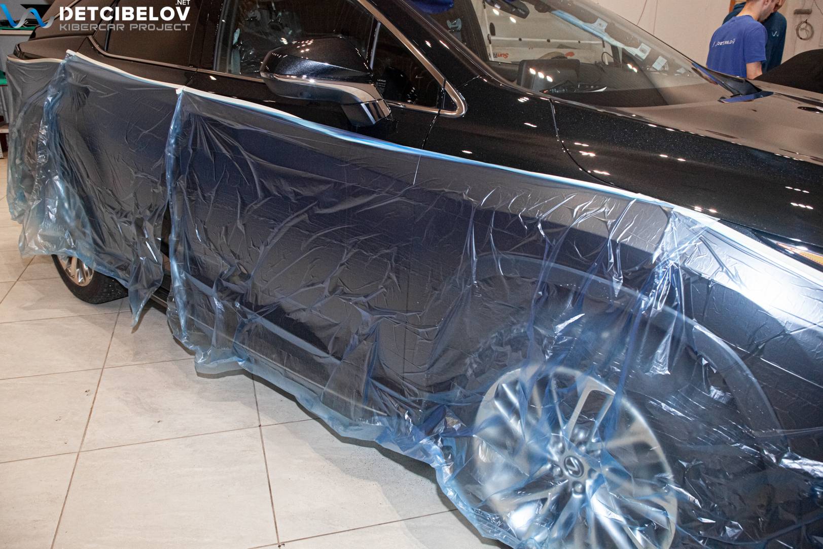Перед тем как приступить к укладке шумоизоляционных материалов «под ключ», проводим предварительную подготовку. Она нужна, чтобы защитить лакокрасочное покрытие автомобиля и открытые детали от повреждений. Для этого оклеиваем скотчем арки дверей и пороги, наносим пленку на все внешние элементы машины, упаковываем в стретч-пленку мелкие пластиковые детали. Для защиты чехлов и дверных карт Lexus RX IV поколение Рестайлинг используем специальные чехлы.