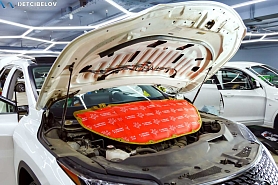 Для виброизоляции капота используем материал толщиной 3 мм – Comfort mat Viper. Он поглощает вибрации и уменьшает их амплитуду, одновременно укрепляя поверхность. Поверх штатной шумоизоляции наносим Comfort mat Fusion Red для блокировки остаточных шумов. Это поможет нейтрализовать звуки и вибрационные колебания, возникающие из-за работы двигателя.