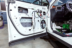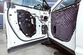 Двери – участок, через который проникает значительная часть внешних шумов, от проезжающих рядом автомобилей и звуков города. Для звукоизоляции на этом участке мы используем Comfort mat Integra. Это материал мембранного типа, который также имеет теплоизолирующие свойства. В результате в салоне становится не только тише, но и теплее.