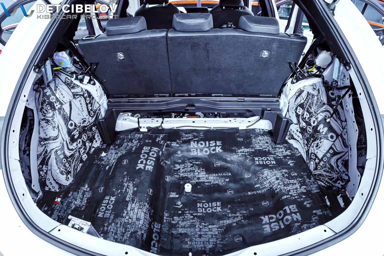 Вторым слоем на полу в салоне, включая участок под вторым рядом сидений и пол в багажнике, клеим NoiseBlock (2 мм) Этот материал выполняет функции тяжелой звукоизоляционной мембраны. Его основная задача – отражать шум, который проникает внутрь салона через материал корпуса.