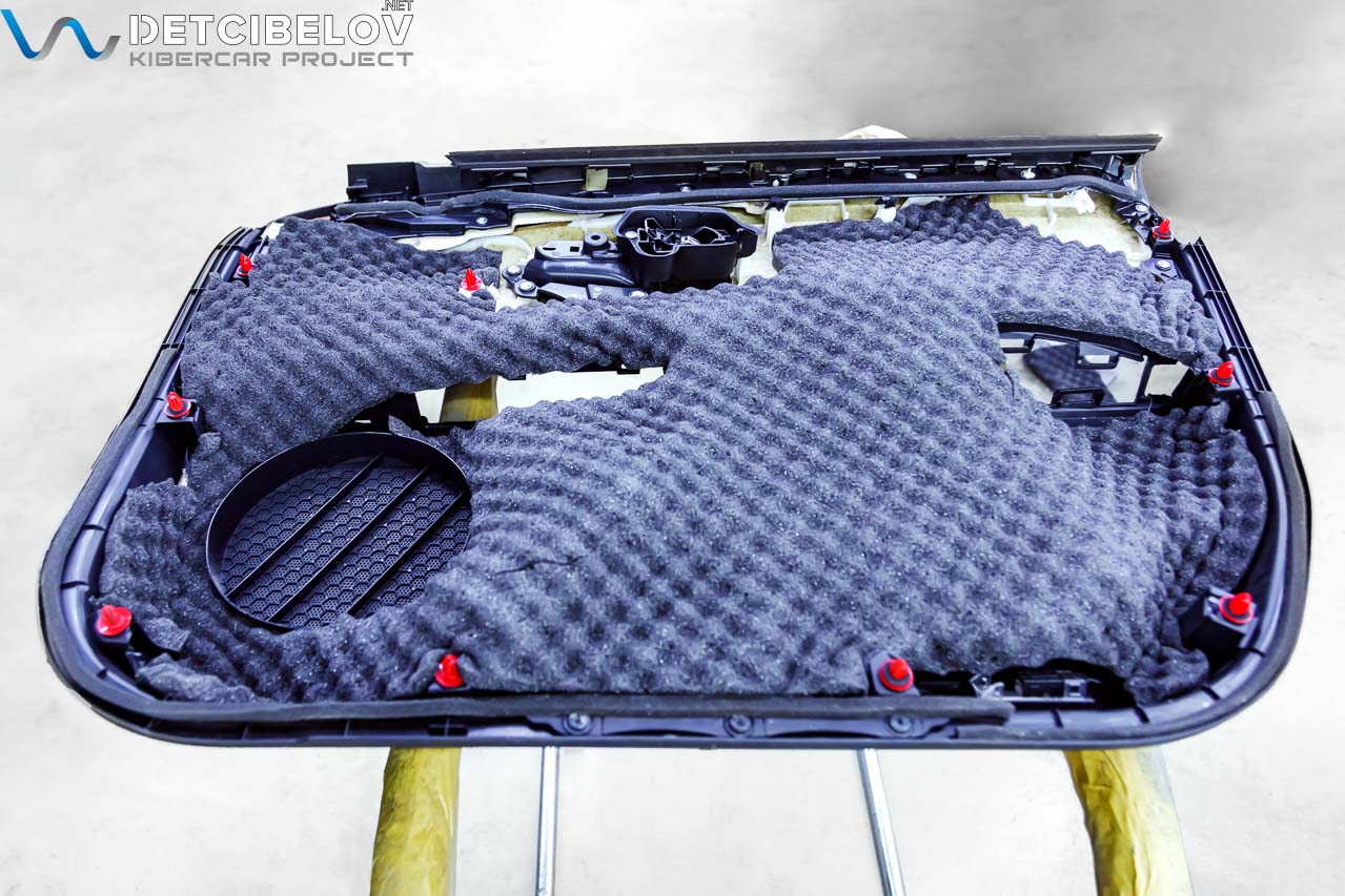 На карты дверей мы наклеили фрагмент Comfort mat Wave Expert – пенополиуретанового материала с волнистой поверхностью. Он ценится за уникальную многоячеистую структуру: вспененный полиуретан эффективно задерживает звуковые волны, не давая им распространяться по салону. Кроме того, объемный материал выступает в качестве уплотнителя, устраняя скрипы и скрежеты дверей во время движения автомобиля.
