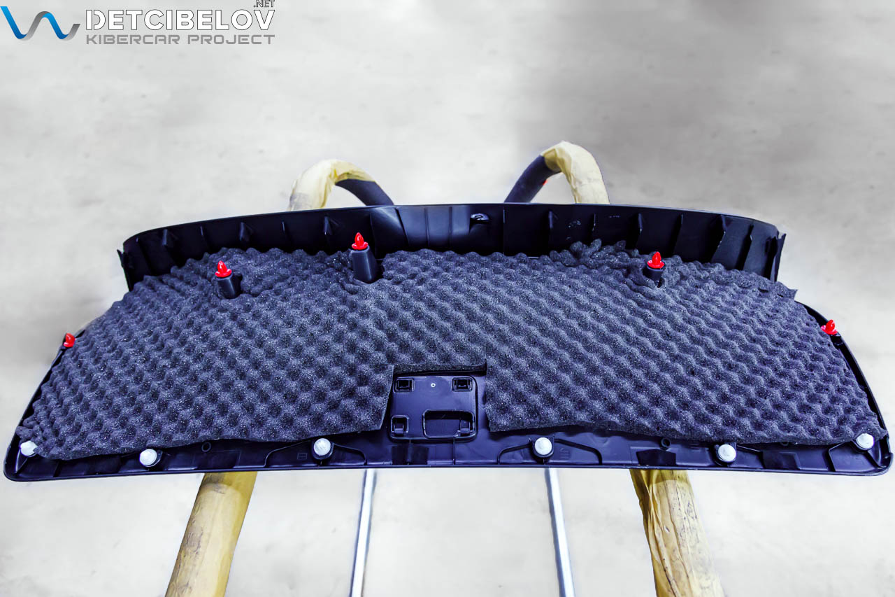 На пластиковой панели крышки багажника используем фрагмент Comfort mat Wave Expert – объемного шумопоглотителя. Волнистая поверхность и открытоячеистая структура материала обеспечивают звукопоглощение в широком диапазоне частот (от 500 до 4000 Гц).