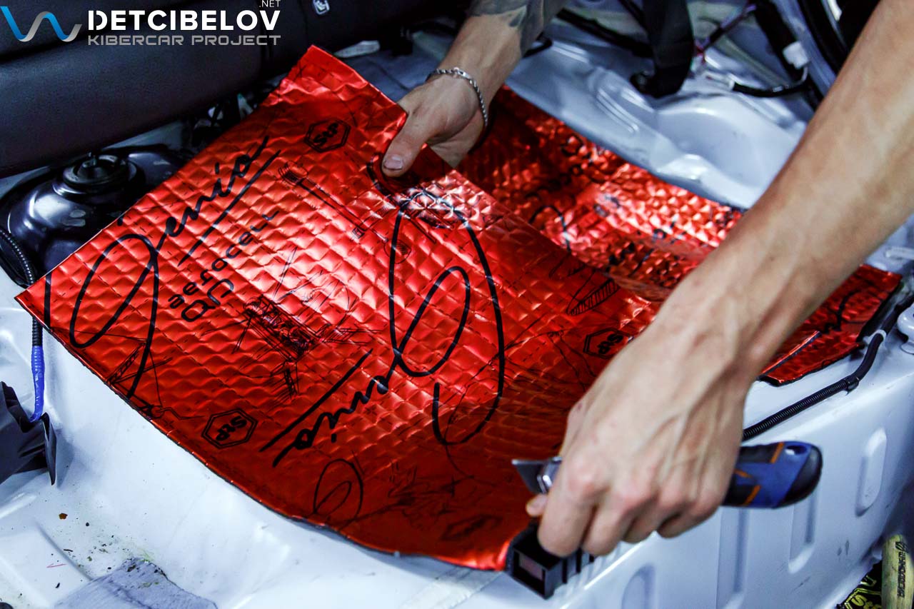 На участке под задним рядом сидений клеим Aerocell QP Genio (4 мм). Его также укладываем в нише багажника и на внутренние арки.