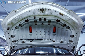 Чтобы устранить вибрации от работающего двигателя, оклеиваем внутреннюю поверхность капота тонким слоем Aerocell QP Genio (4 мм). Инновационная структура материала объясняет его комплексные свойства: он укрепляет поверхность металла, снижает амплитуду вибраций и улучшает теплоизоляцию на участке, В результате шум от работающего двигателя практически не проникает в салон. Кроме того, мотор меньше перегревается в жару и дольше сохраняет тепло зимой, что снижает вероятность его поломки.
