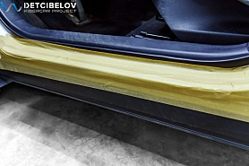Согласовав все детали с заказчиком, приступаем к работе. Защищаем автомобиль: пленка на кузов, скотч на пороги и арки, стрейч-пленка на мелкие детали, чехлы на сиденья и карты дверей. Все, что мешает укладке материалов, убираем из салона.