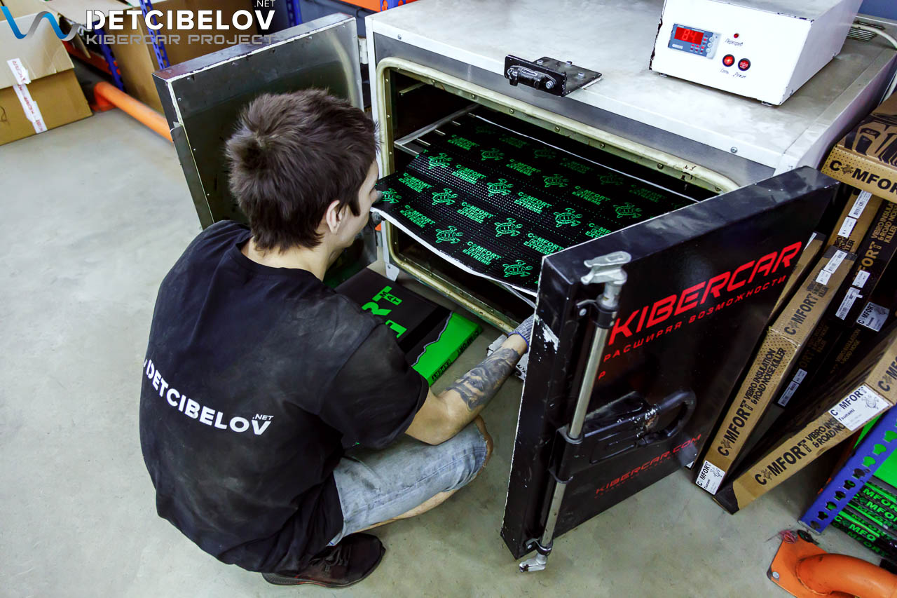 Подготавливаем для устранения вибраций на участке днища материал Comfort mat Extreme 3.5 – мастично-битумный вибродемпфер. Для этого используем специальные печи, разогретые до температуры 60-80 градусов. Помещаем листы материала в печь, и нагреваем: это поможет улучшить адгезию.