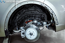 Шумоизоляция колесных арок должна блокировать вибрации и шумы, которые возникают из-за соприкосновения шин с дорожным полотном. Учитывая специфику участка, необходима комплексная защита. Для доступа к поверхности колесных арок временно убираем все четыре подкрылка.