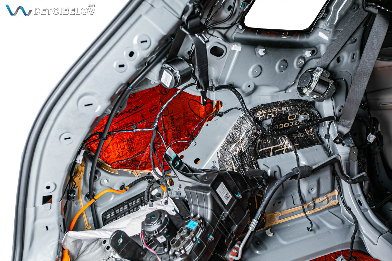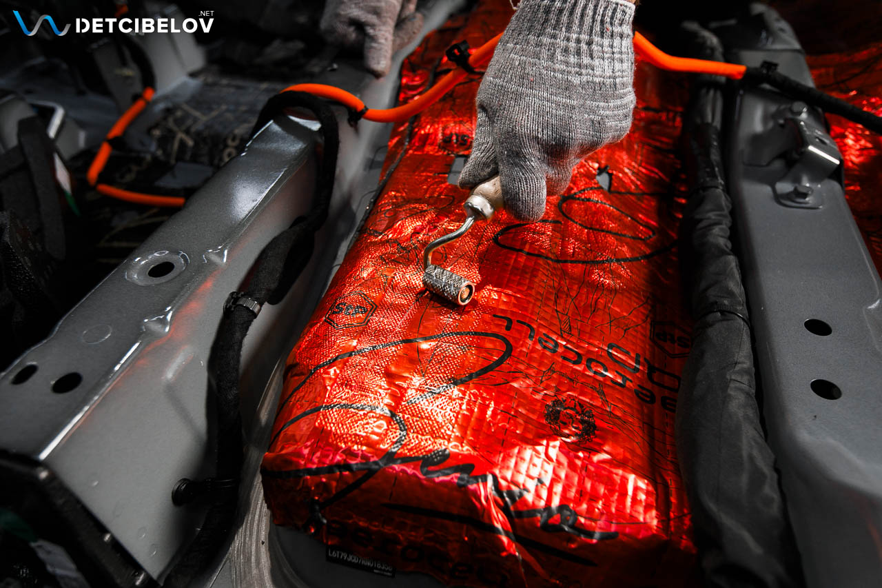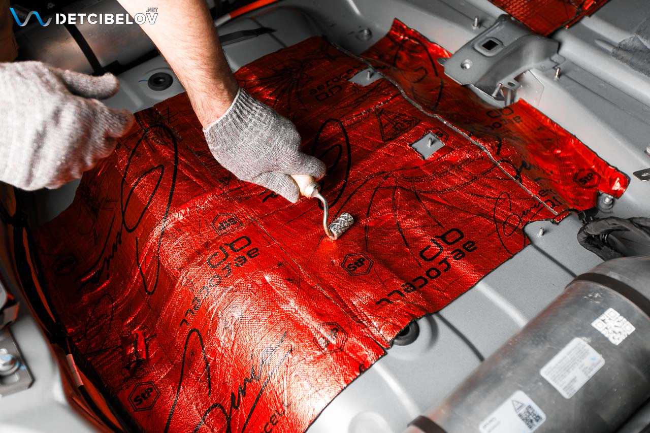 Aerocell QP Genio (4 мм) — инновационный материал, сочетающий в себе эффективный полимерный слой и запатентованные гранулы Aerocell. Наносим его на пол под задними сиденьями, пол в багажнике и крылья.