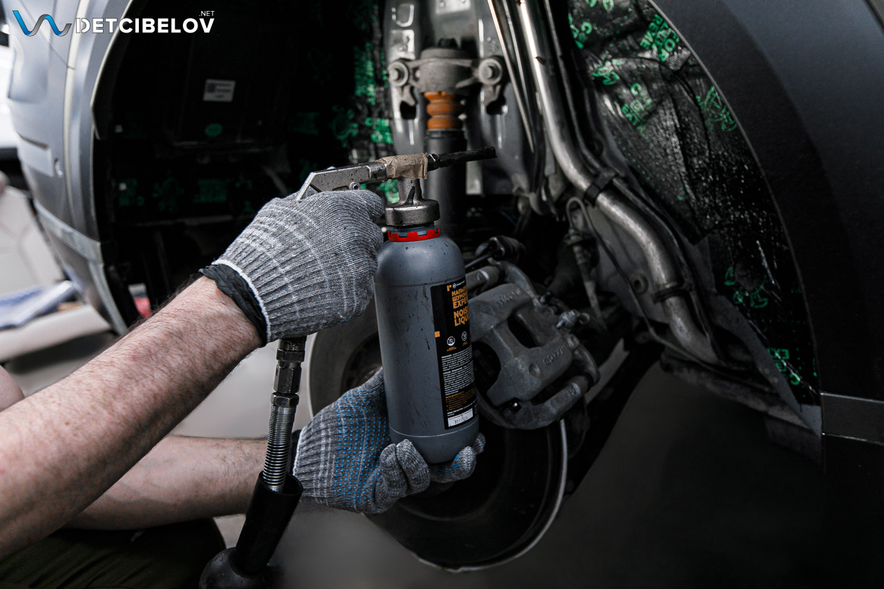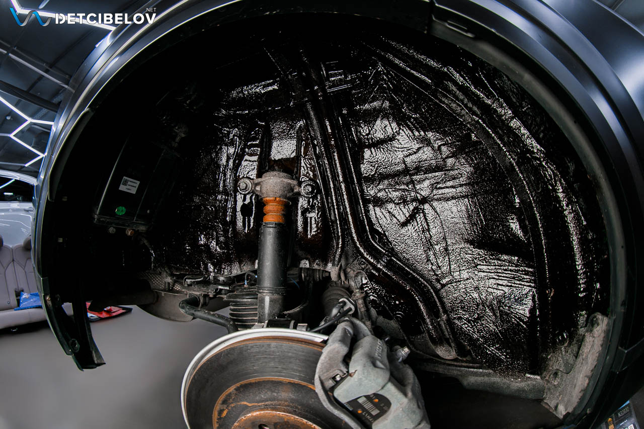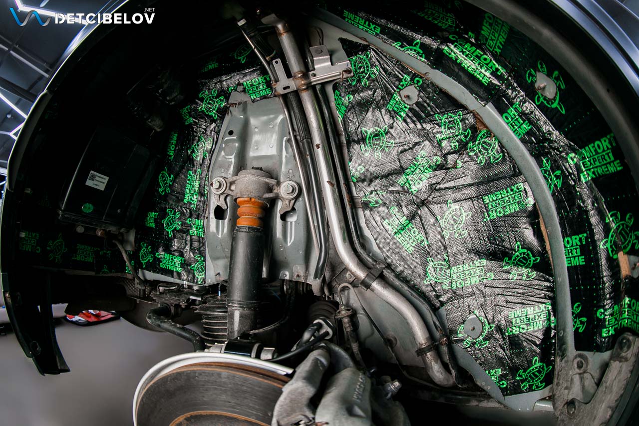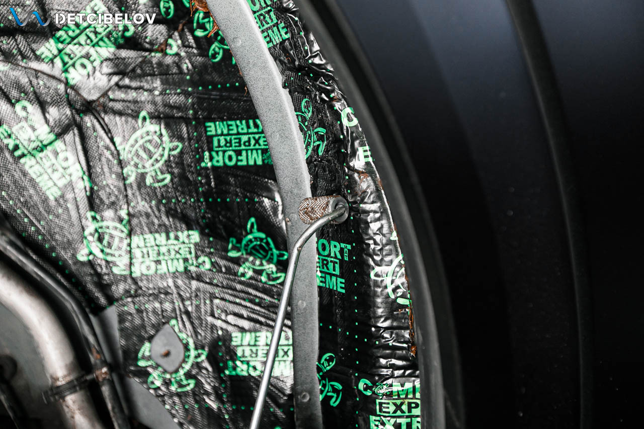 Финальным этапом шумоизоляции будет шумоизоляция колесных арок. Это позволит нам существенно усилить эффект снижения шума, издаваемого резиной автомобиля. Сначала снимаем 4 подкрылка, обезжириваем их поверхность и наносим следующие слои.
