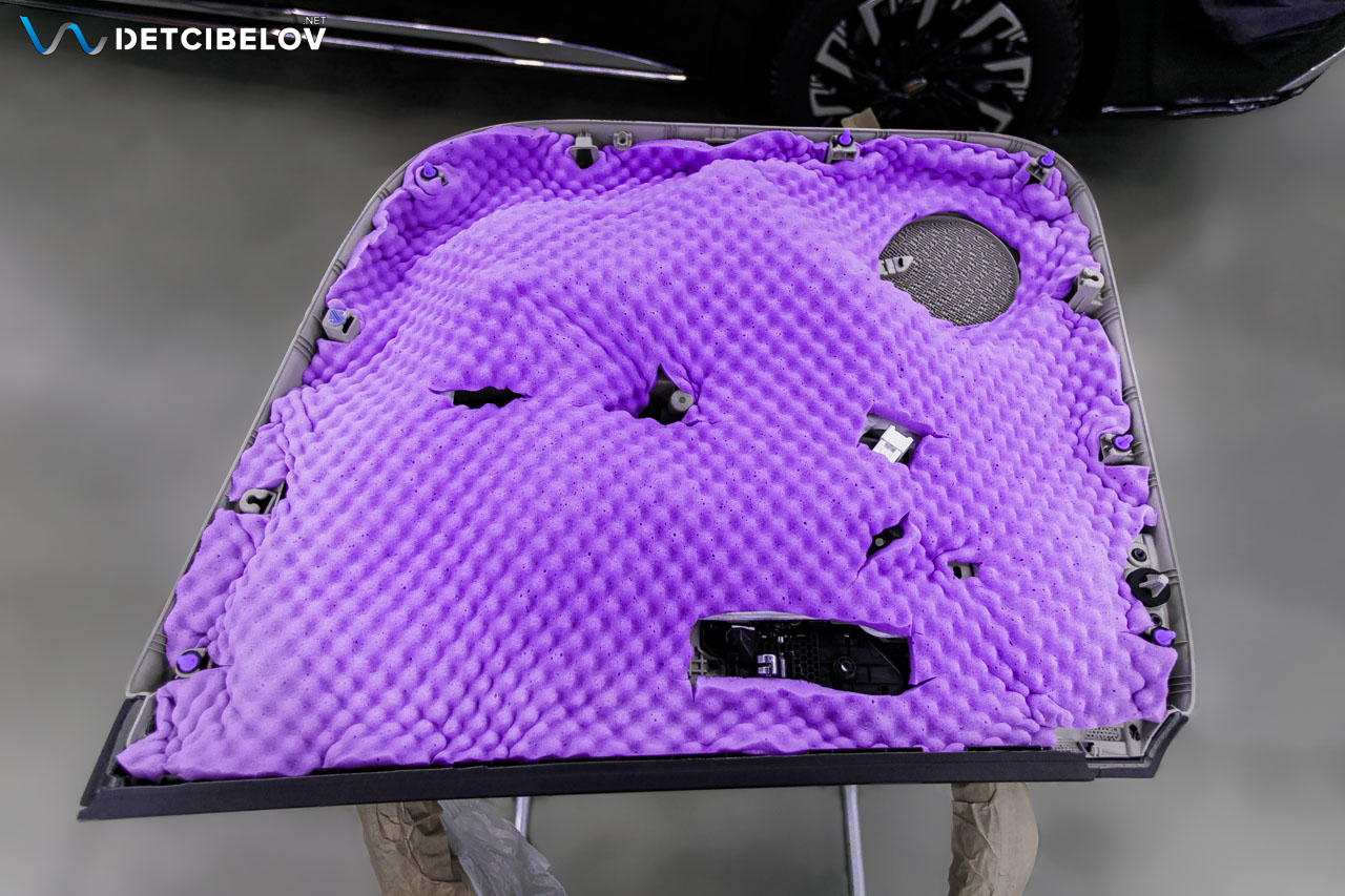 Заключительным слоем используем шумопоглощающий материал последнего поколения – пенополиуретановую пенорезину StP Biplast Premium (15 мм) с увеличенным коэффициентом шумопоглощения, который окончательно задерживает посторонние шумы. Этот же материал, выступает в роли антискрипа. Наносим его на карты дверей.