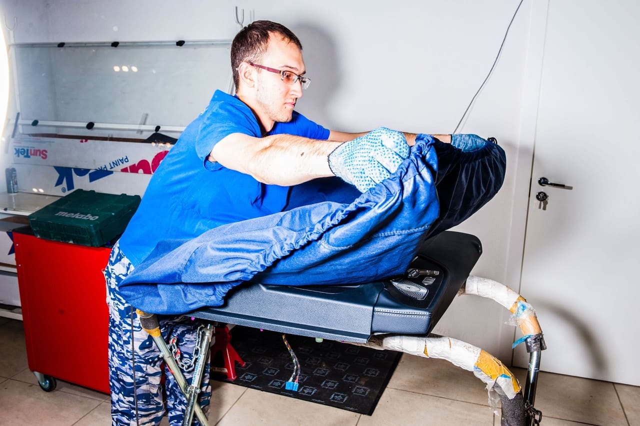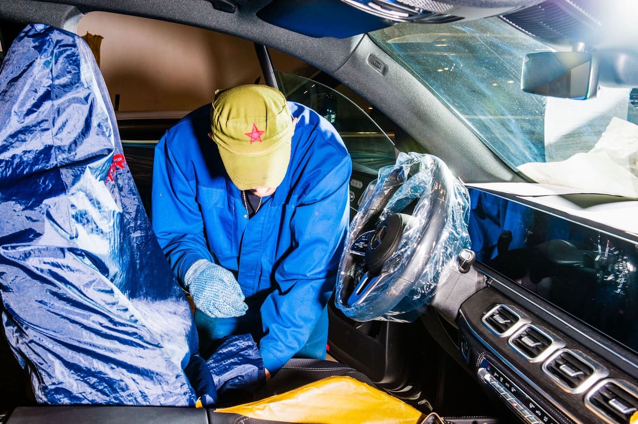 После того, как обговорили все нюансы, и вопрос цены  закрыт, вы смело можете уезжать по своим делам, доверив свой Mercedes-Benz нашим опытным специалистам. А мы начинаем! И начинаем мы с защиты автомобиля и разбора всех элементов в салоне, которые будут мешать проведению работ. Итак, кузов автомобиля обматываем стретч-пленкой, на пороги наклеиваем защитный скотч. Карты дверей и сиденья демонтируем и убираем их в чехлы. Теперь, когда все подготовлено, приступаем поэтапно шумоизолировать все части вашего Мерседеса.