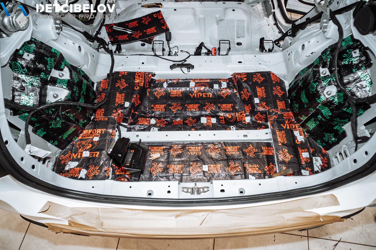 Для обработки крышки багажника в некоторых моделях возможно уложить всего один слой материала только на пластиковую панель - Wave Expert. Это уплотнительно-шумопоглощающий вязкоэластичный материал, который максимально избавит вас от шумов. В дополнении к этому слою в некоторых моделях мы демпферно наклеивали Dark D3 на саму крышку багажника. Сейчас его заменил Viper.