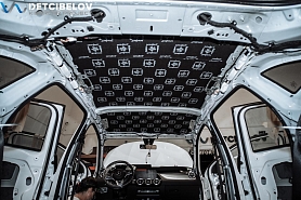 Далее переходим к шумоизоляции крыши. После демонтажа всей обшивки мы также обезжириваем поверхность потолка. Теперь потолок готов к наклеиванию слоев, первым из которых идет Dark D3 Premium. В новых работах вместо него выступает Viper, который является доработанным и усовершенствованным продолжением линейки D3. Этот материал премиальной серии идеально подходит для виброизоляции потолка.