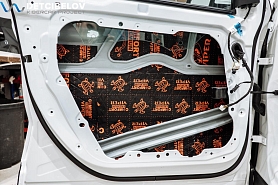 • Самая легкая шумоизоляция автомобиля от ведущих брендов. Она обеспечивает оптимальный результат при однослойной обработке кузова автомобиля. Материал обладает одновременно как шумо-, так и виброизоляционными свойствами, что позволяет укладывать материал в один слой, вместо двух, используемых при многослойной классической шумоизоляции автомобиля. Также мы дополнительно обрабатываем двери акустическим материалом для снижения скрипов и увеличения акустического комфорта.