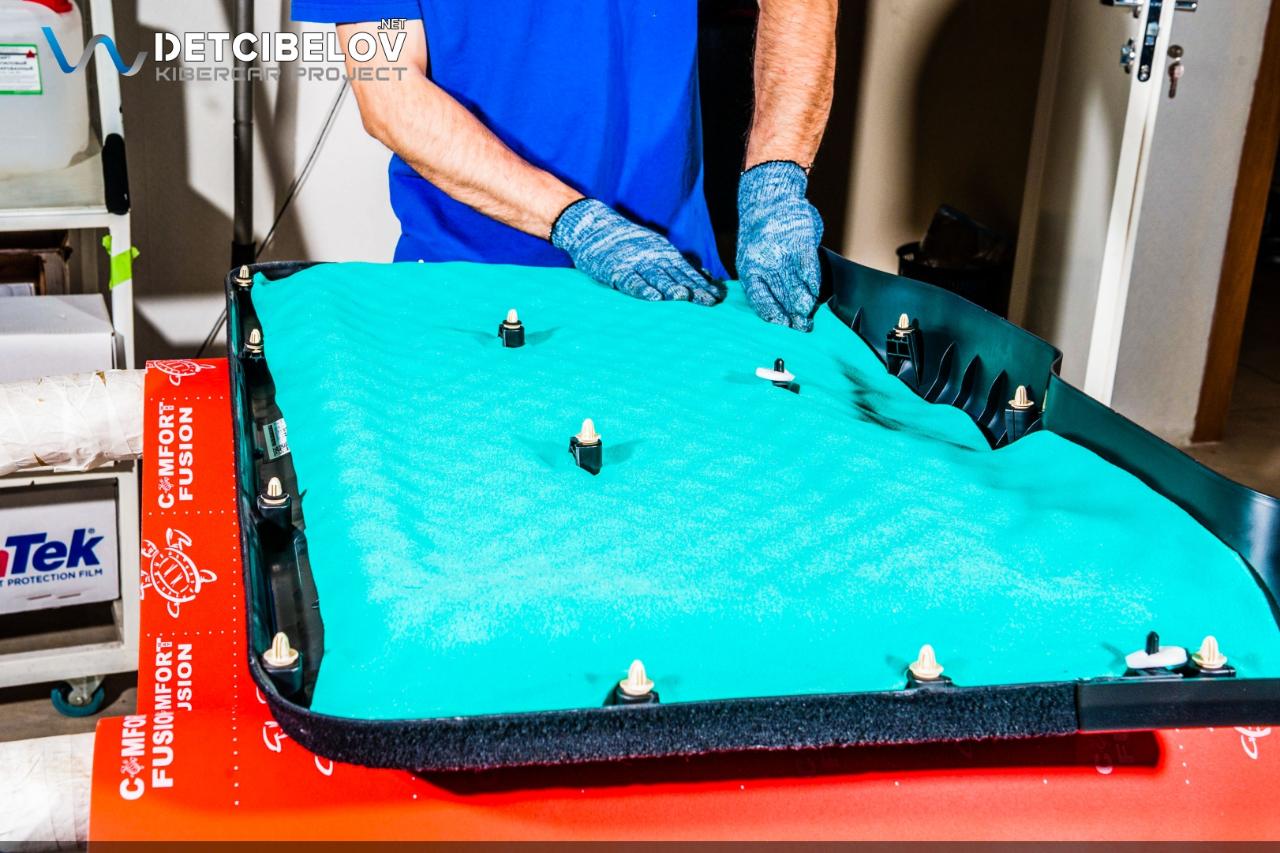 На полу в передней части пола клеим Comfort mat Vision Red (6 мм). Материал имеет звукоизолирующие и вместе с тем шумопоглощающие свойства.