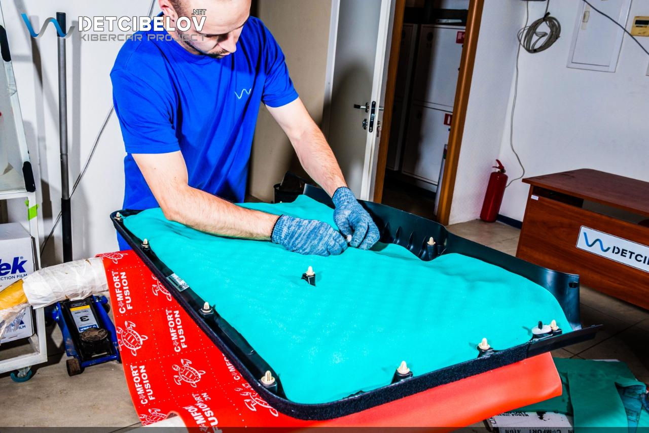 Под задним диваном на вибродемпфер клеим Comfort mat Comfort mat Blockshot 2 в 1 (7 мм). Он будет нейтрализовать посторонние шумы и улучшать теплоизоляцию пола.