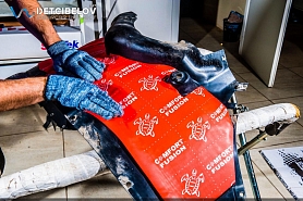 На внутреннюю поверхность капота клеим вибродемпфер Comfort mat Dark D3 Premium (3 мм). Здесь есть штатная шумоизоляция, но низкого качества. Не удаляем ее, а дополняем Comfort mat Fusion Red (3 мм).