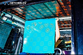 На обезжиренную поверхность клеим облегченный вибродемпфер Comfort mat Dark D3 Premium (3 мм). Он уменьшит вибрации потолка во время движения.