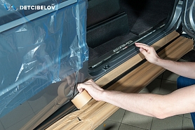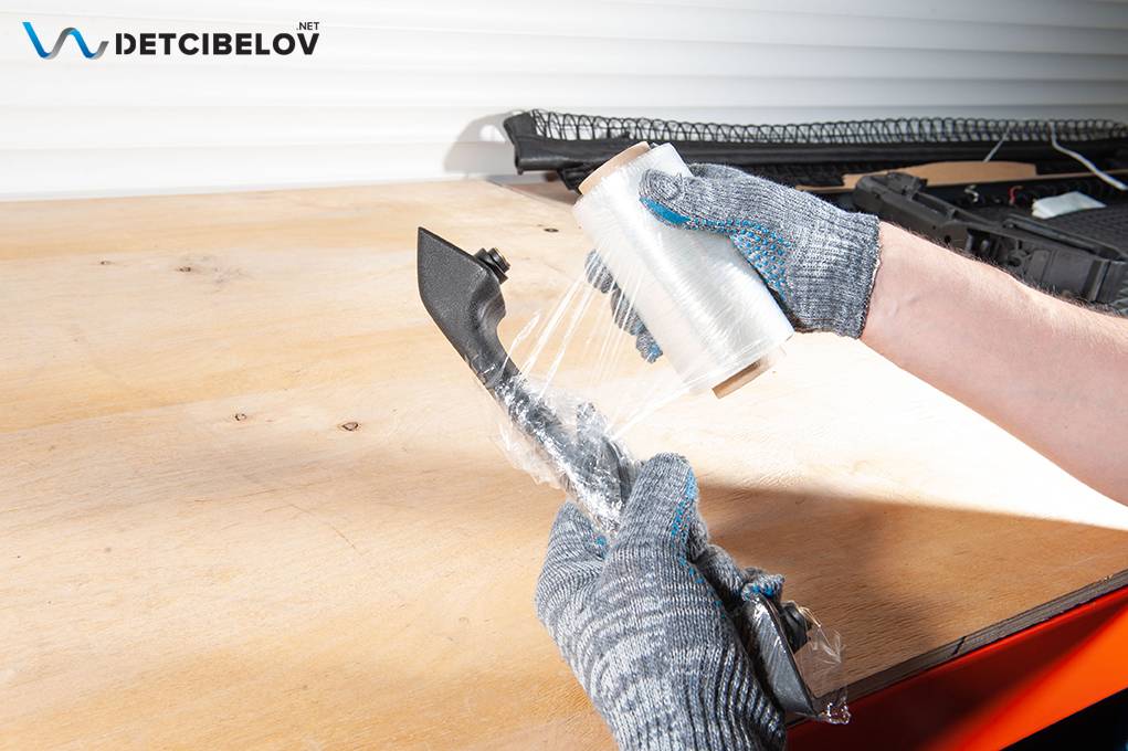 Для проведения полной шумоизоляции важно защитить элементы интерьера и кузова. Для этого используем обычную пленку и стрейч-пленку, оклеиваем пороги и арки дверей скотчем. Подбираем чехлы для руля и других элементов интерьера, которые остаются в салоне.