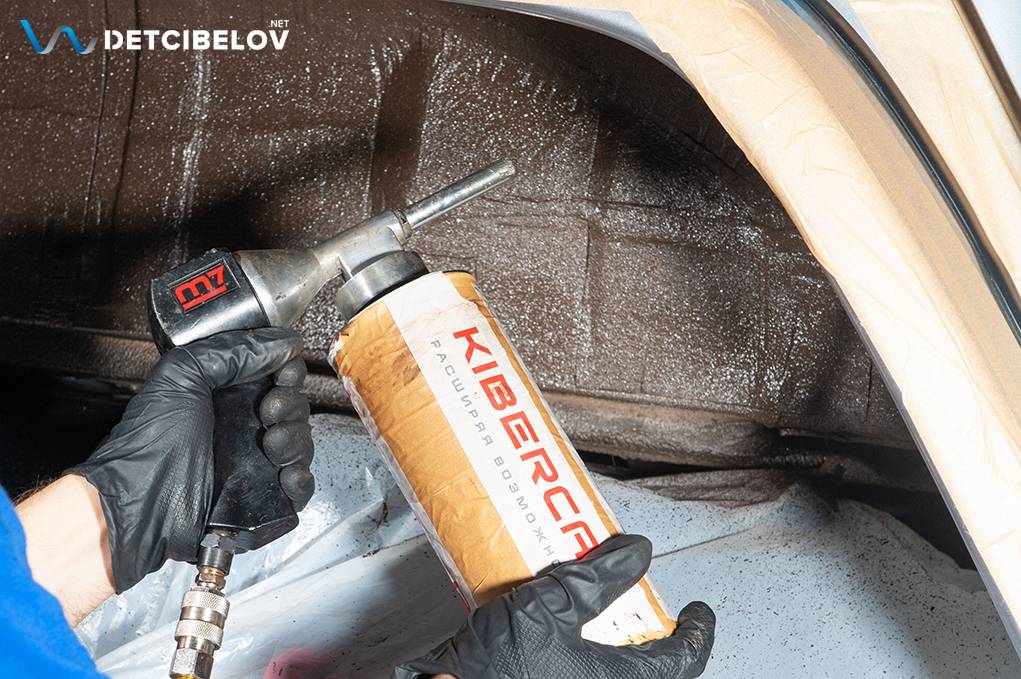 Затем обрабатываем поверхность колесных арок напыляемым полимером. Он обеспечит герметизацию швов.