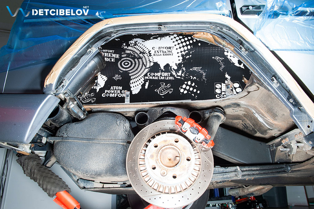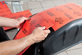 Клеим Extreme 3.5 на полу в салоне. На внутренних арках, в багажнике и на крыльях используем более тонкий вибродемпфер Comfort mat Dark D3 Premium (3 мм).