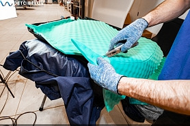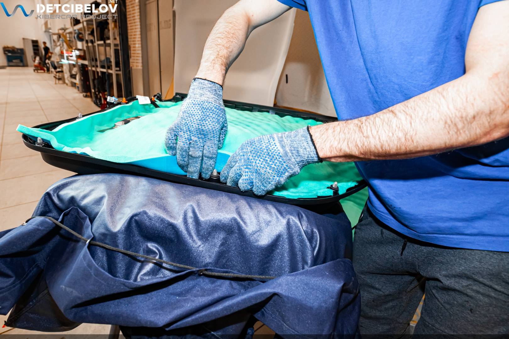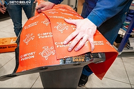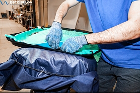 Перед началом укладки нужно подготовить вибродемпфер Comfort mat Extreme 3.5. Материал, рассчитанный на высокие вибрационные нагрузки, мы используем на полу в салоне и внутренних арках. Его нужно предварительно разогреть, для чего мы помещаем листы вибродемпфера в специальную печь.