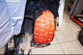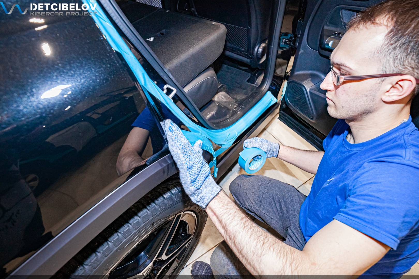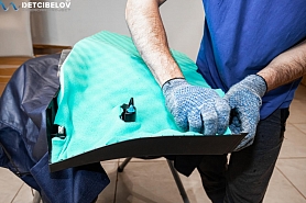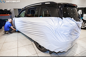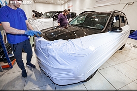 Стартуем с подготовки салона и кузова: убираем все лишнее из автомобиля, демонтируем кресла и сиденья, оклеиваем широким скотчем арки дверей. Для защиты мелких пластиковых деталей используем стрейч-пленку, для внешних элементов кузова – тонкую полиэтиленовую пленку. Подбираем чехлы для руля и оборудования, которое нельзя убрать из салона.