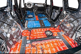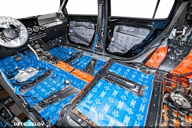 На полу в салоне укладываем Comfort mat Comfort mat Blockshot 2 в 1 (7 мм). Благодаря многослойной структуре он отлично справляется с разнородными нагрузками. Помимо звукоизоляции, материал улучшает теплоизоляцию салона.