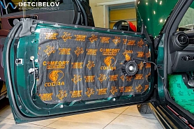 Второй материал, который используется на участке дверей – Comfort mat Cobra. Это вибродемпфер на мастичной основе, толщиной всего 2.3 мм. Он имеет доступную стоимость, хорошую адгезию и высокий уровень КМП. Материал может монтироваться на любую поверхность.