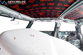 На следующем этапе мы переходим к обесшумливанию крыши – тонкой металлической плоскости без ребер жесткости. Через нее практически не проникает внешний шум, зато этот участок уязвим перед вибрационными колебаниями, и может участвовать в распространении внутреннего шума. Именно поэтому для шумоизоляции потолка мы используем комбинацию из двух слоев – вибродемпфера и шумопоглотителя.