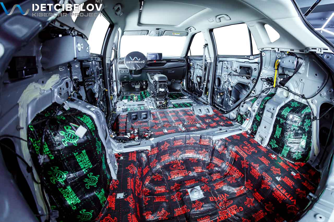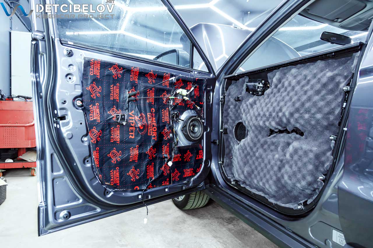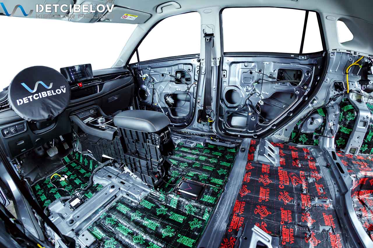 • Никаких компромиссов! Только топовые материалы последнего поколения от ТМ "Comfort mat" с максимальной эффективностью и максимальным количеством слоев. Также использование вибродемпфирующих материалов высокой жесткости с разогревом в печи и дополнительной напыляемой шумоизоляцией для колесных арок.