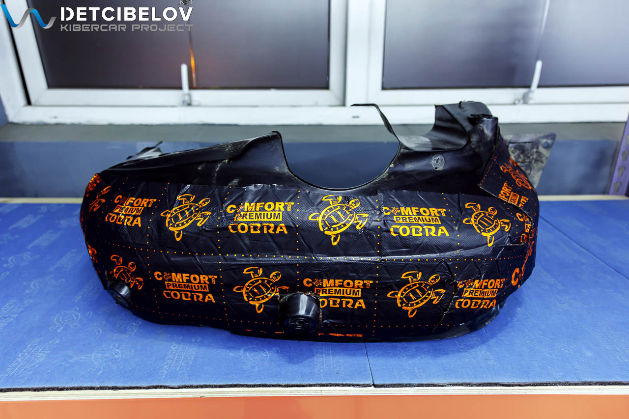 Завершающий этап – шумоизоляция подкрылков. На обезжиренную поверхность клеим вибродемпфер Comfort mat Cobra (2,3 мм), чтобы сделать вибрации менее ощутимыми.