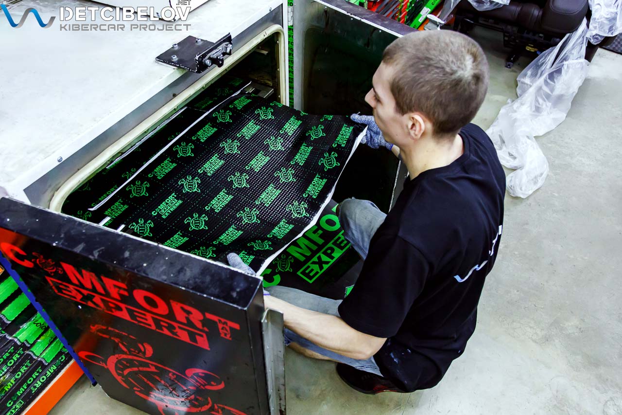 Шумоизоляция пола – один из самых ответственных участков работы. Чтобы уменьшить вибрации днища, будем использовать материал, предназначенный для экстремальных нагрузок – Comfort mat Extreme 3.5 (3,5 мм). У него мастично-битумная основа, и два слоя алюминиевой фольги, которые обеспечивают хорошую адгезию к поверхности. Перед укладкой выполняем расчеты и помещаем материал в специальную печь, разогретую до 60-80 градусов.