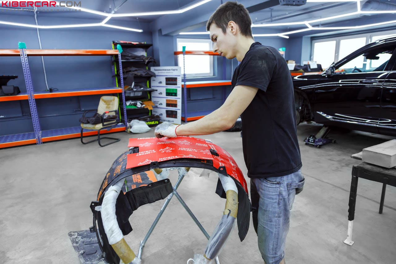 Работа начинается с демонтажа подкрылков и обезжиривания их поверхности.