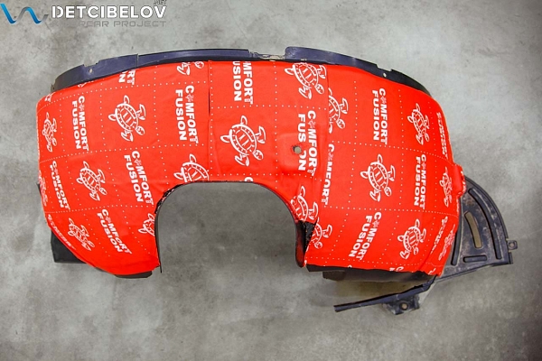 Третий слой нужен для шумоизоляции пластиковых подкрылков. Если в авто они не пластиковые, этот и следующий этап можно пропустить. Пластиковые подкрылки покрывают слоем облегченного вибродемпфера Comfort Mat Dark D3 Premium (3 мм), а затем – шумопоглощающим материалом Comfort Mat Fusion Red (3 мм). Такая многослойная конструкция существенно усиливает эффект снижения шума, который издает резина автомобиля.