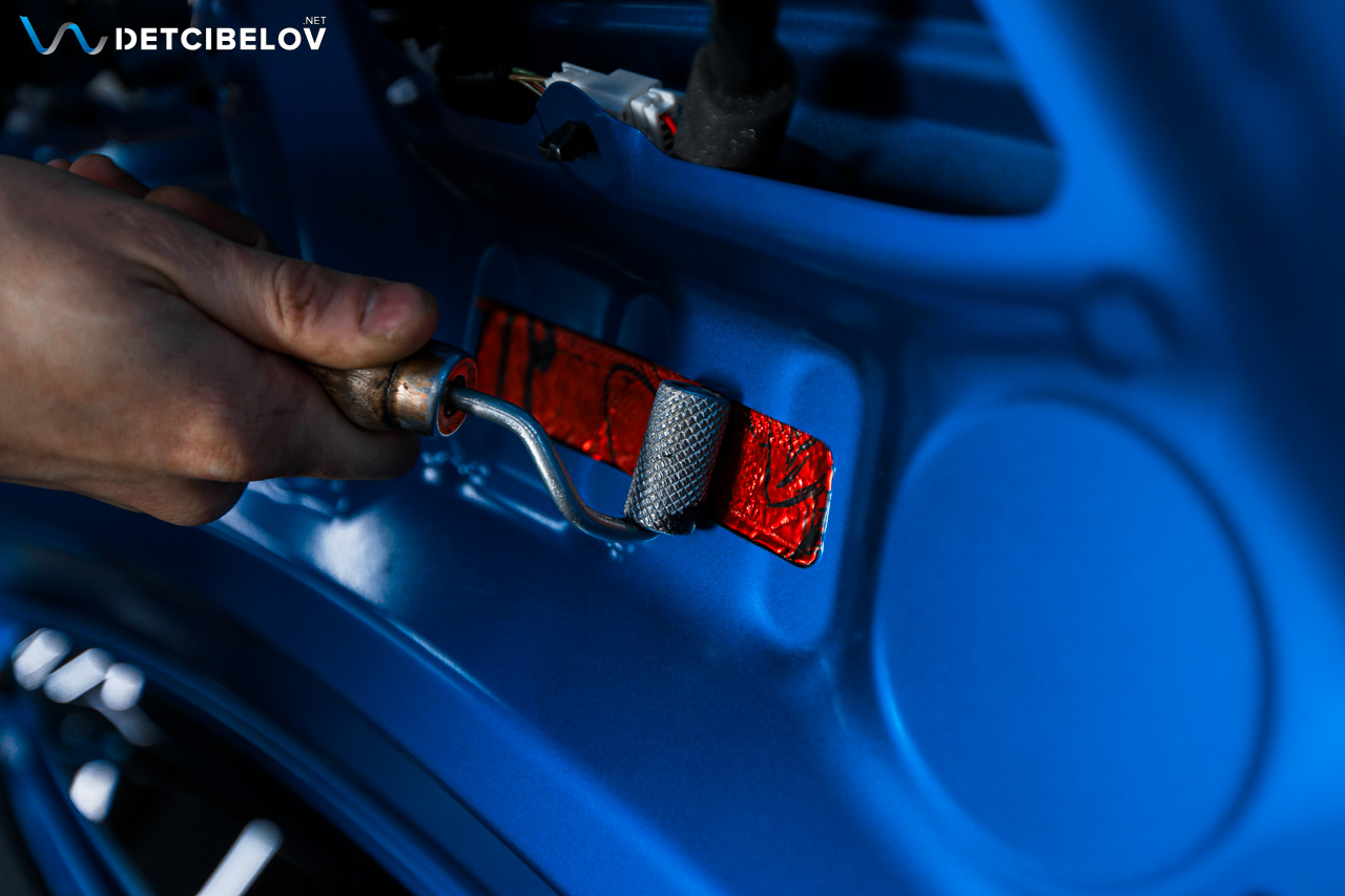 Работы по шумоизоляции начинаем с дверей. Максимально аккуратно разбираем дверные обшивки. После этого подготавливаем поверхность и обезжириваем все участки и наносим первый слой: