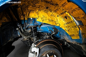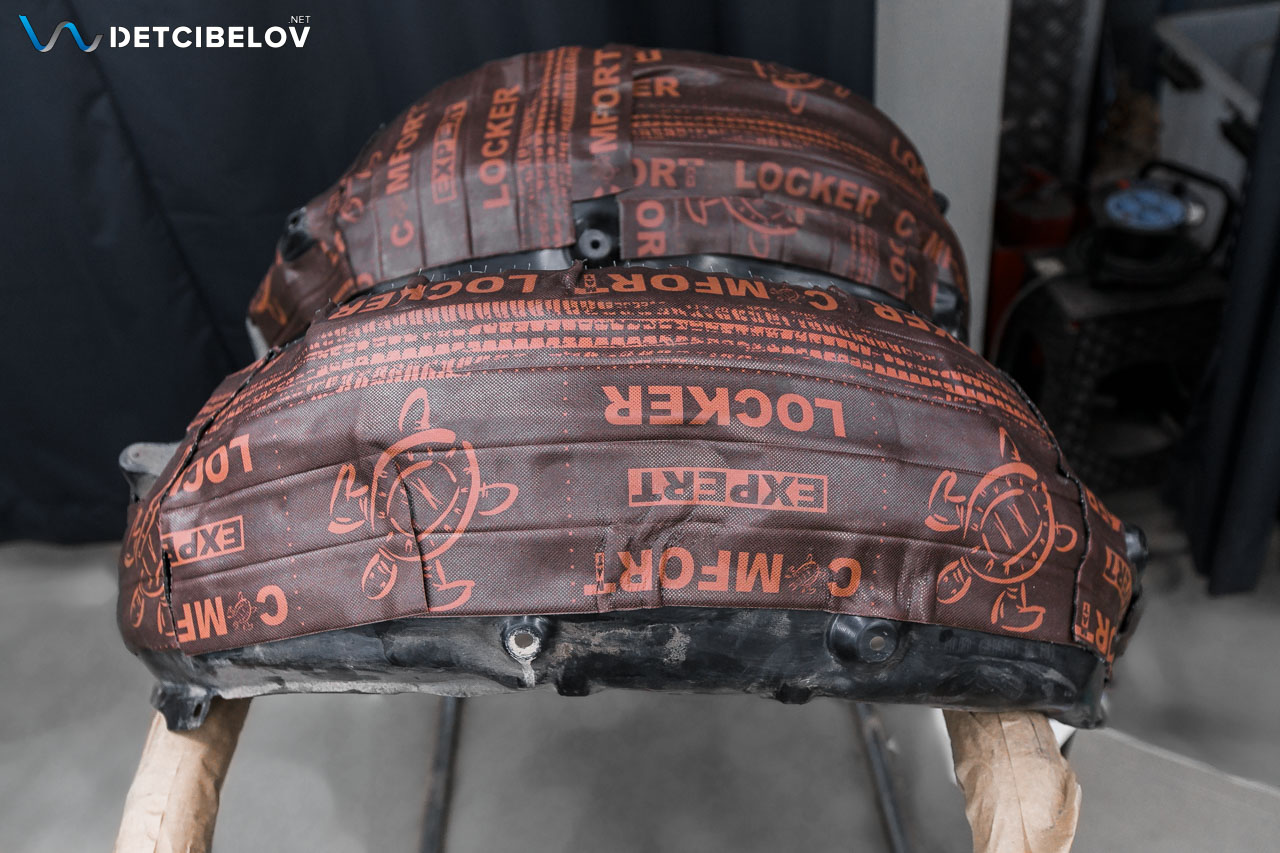 Подкрылки обезжириваем и наносим вибродемпфер Comfort mat Locker (3 мм) – абсолютно новая разработка облегченной звукоизоляционной мембраны для шумоизоляции войлочных подкрылков.