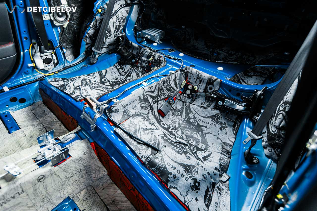 StP Bromo (7 мм) – комбинированный материал-сэндвич, объединяющий в себе функции звукопоглощения и звукоизоляции. Открытоячеистая структура мягкого слоя эффективно рассеивает звук и уменьшает его амплитуду. Тяжелая звукозащитная мембрана отражает проникающие звуковые волны и не пропускает их во внутреннее пространство автомобиля. Наносим его на пол под задними сиденьями, пол в багажнике и внутренние арки.