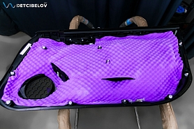 Заключительным слоем используем шумопоглощающий материал последнего поколения – пенополиуретановую пенорезину StP Biplast Premium (15 мм) с увеличенным коэффициентом шумопоглощения, который окончательно задерживает посторонние шумы. Этот же материал, выступает в роли антискрипа. Наносим его на карты дверей.