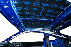 Следующий этап – шумоизоляция крыши. Максимально аккуратно чистыми одноразовыми перчатками демонтируем потолочную обшивку и обезжириваем поверхность потолка. После предварительной подготовки приступаем к шумоизоляции.