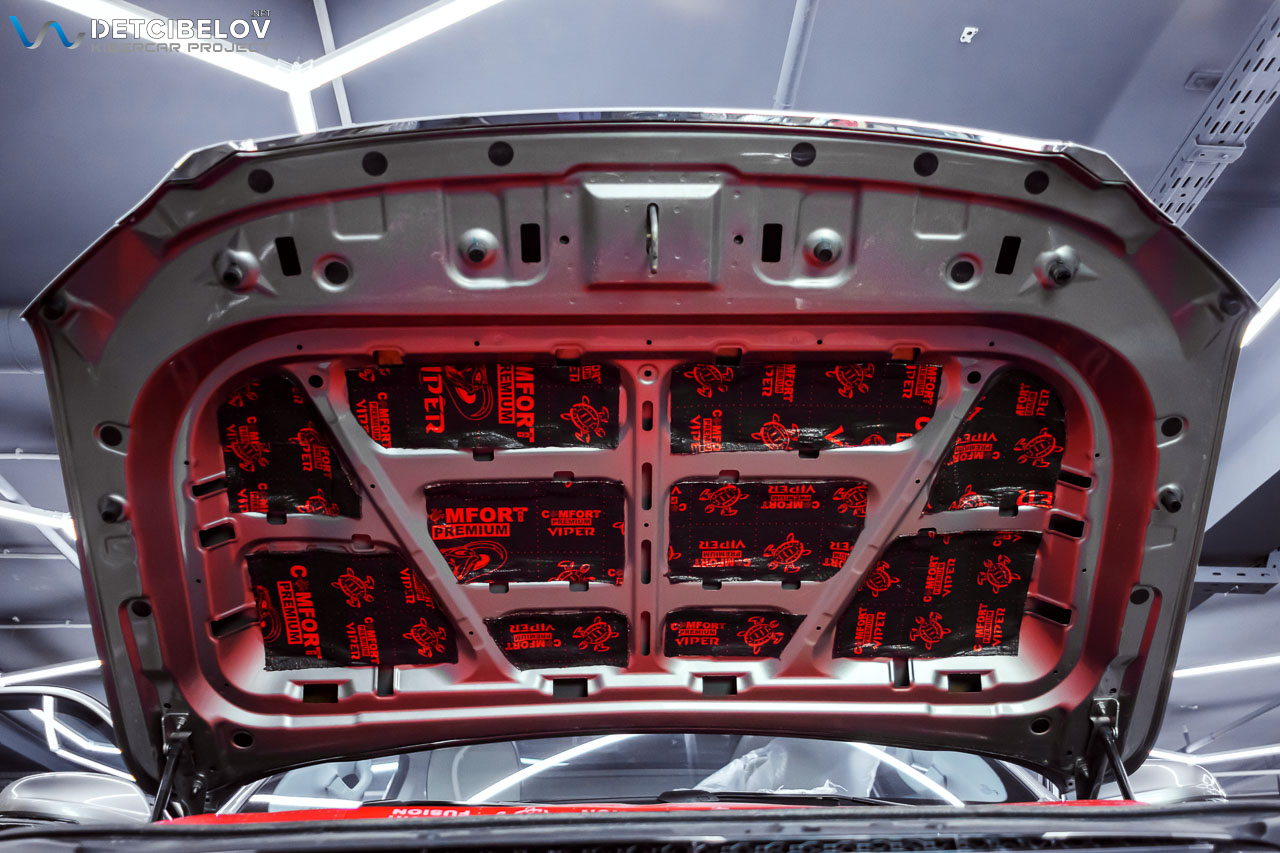 Капот. Внутреннюю поверхность капота обрабатываем материалом Comfort mat Viper (3 мм), а на штатную шумотеплоизоляцию мы наклеили Comfort mat Fusion Red (3 мм).