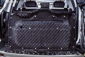 На крышку багажника мы демпферно нанесли Comfort mat Viper (3 мм), в качестве второго слоя использовали Comfort mat Fusion Red (3 мм), а на пластиковую панель наклеили Comfort mat Wave Expert (15 мм) с увеличенным коэффициентом шумопоглощения.