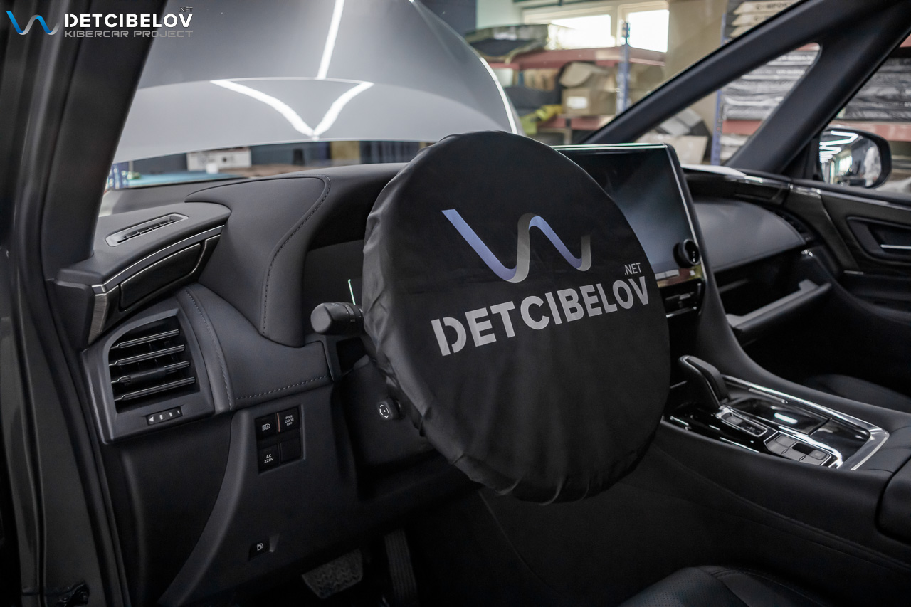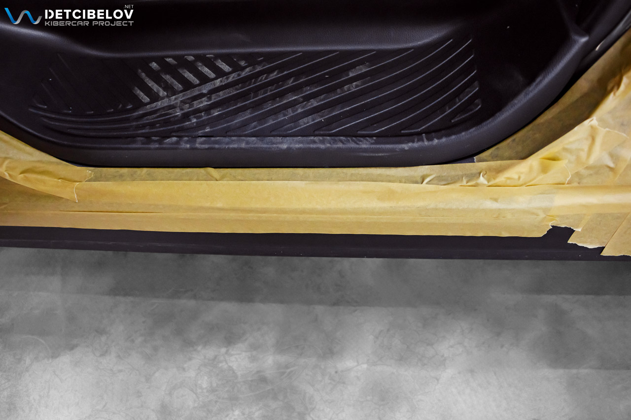 Приступаем к работе. Первым делом максимально защищаем автомобиль: оклеиваем пленкой все внешние элементы автомобиля, затем наносим скотч на пороги и арки дверей, упаковываем все мелкие пластиковые элементы в стретч-пленку. Сиденья и карты дверей помещаем в специальные чехлы.