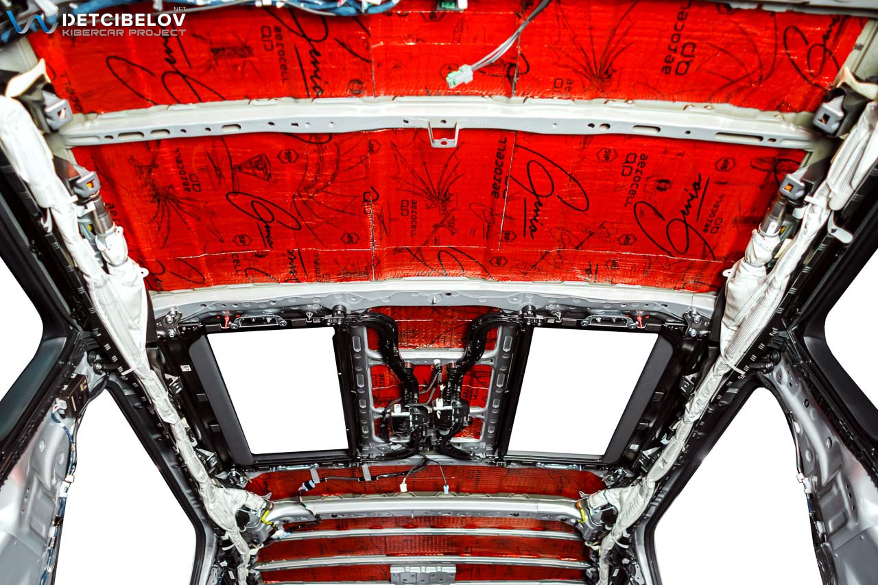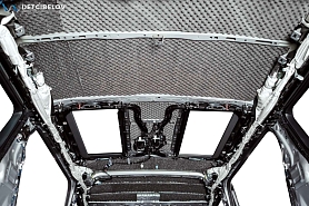 Следующий этап – шумоизоляция крыши. Максимально аккуратно чистыми одноразовыми перчатками демонтируем потолочную обшивку и обезжириваем поверхность потолка. После предварительной подготовки приступаем к шумоизоляции.